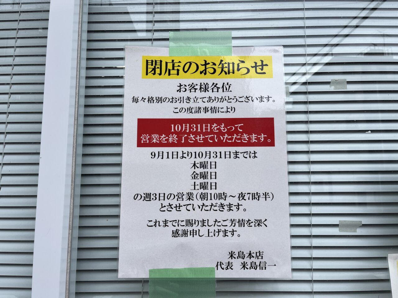 2025年9月1日(月)から木曜・金曜・土曜の週3日の営業となり10月31日(金)をもって閉店されます。
