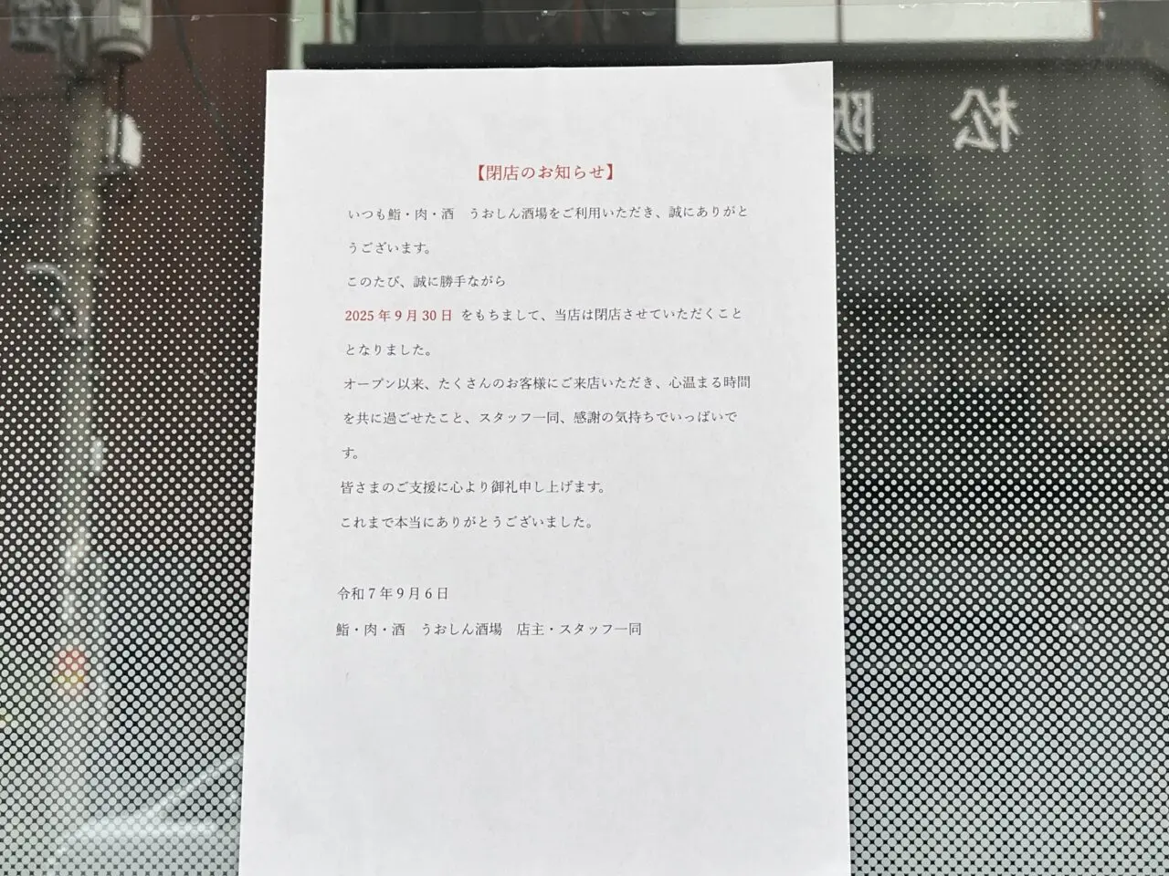2024年11月にオープンした「鮨・肉・酒 うおしん酒場」が閉店していました。