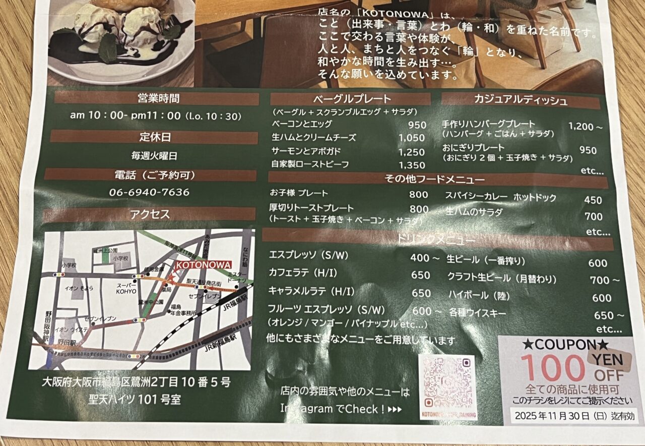 【大阪市福島区】もちもちベーグルやこだわりラテ♪聖天通商店街に「Cafe & Dinning KOTONOWA」が10月1日(水)オープン!