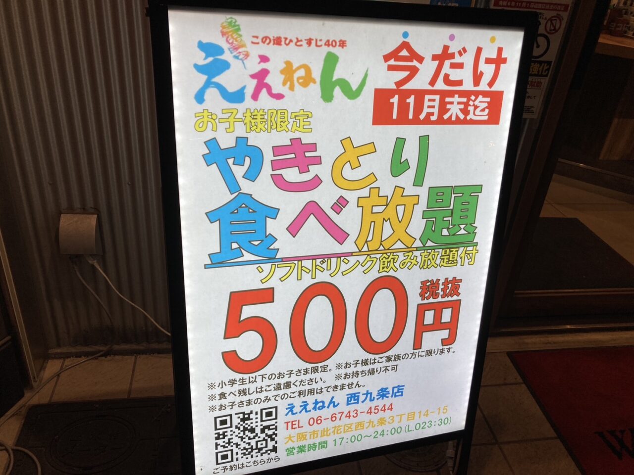 西九条駅前の「やきとり ええねん 西九条店」にてお得なキャンペーンが開催中です!店頭の案内によると、2025年11月末までお子様限定でやきとり食べ放題 税抜 500円(税込 550円)となります!なんとソフトドリンクも飲み放題。利用は小学生以下のお子様限定、利用者のご家族のお子様に限ります。お持ち帰りは不可でお子様のみでのご利用はできません。