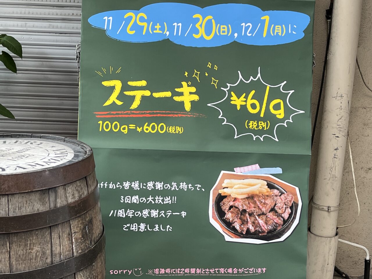 【大阪市福島区】「街の肉バル Buff 福島店」で11月29日(土)~の3日間ステーキがとってもお得に食べられる周年祭が開催