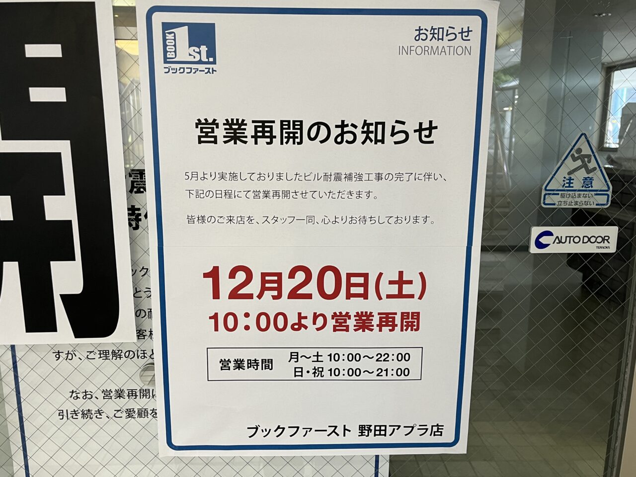 2025年5月26日(月)からビルの耐震補強工事に伴い一時休業している「ブックファースト野田アプラ店」が12月20日(土)に営業再開します。