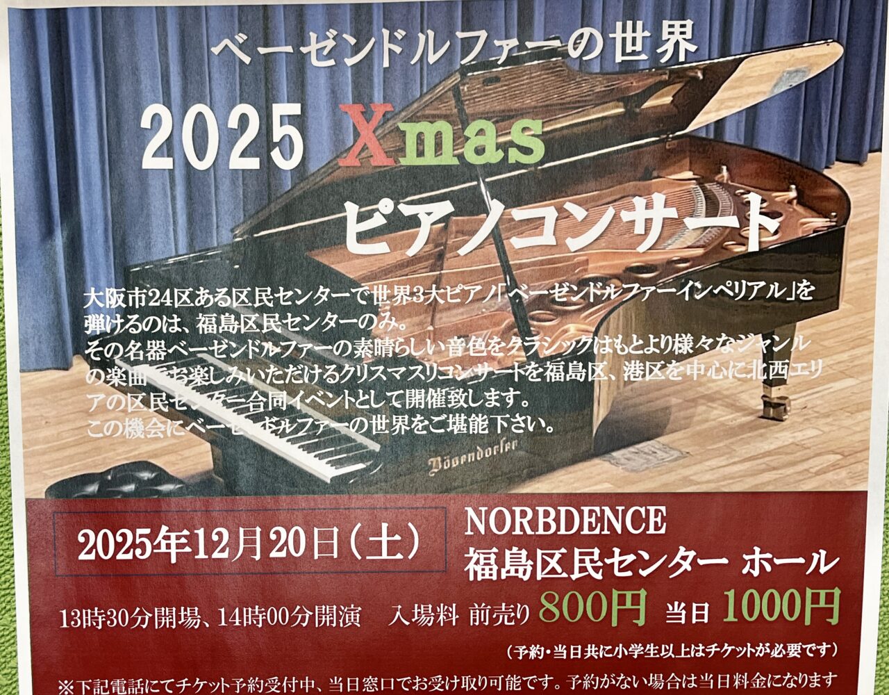 2025年12月20日(土)はNORBDENCE福島区民センター1階ホールにて『ベーゼンドルファーの世界Xmasピアノコンサート』が開催されます。