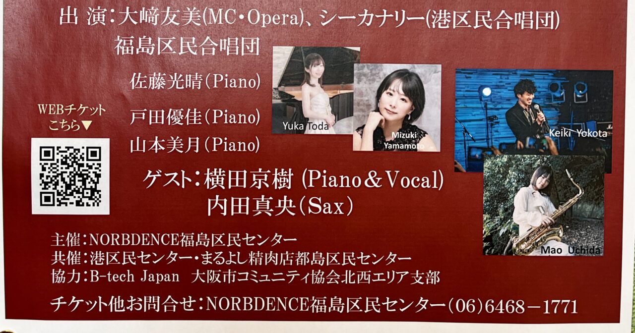 小学生以上はチケットが必要で、当日券より200円お得な前売り券販売は11月20日(木)からNORBDENCE福島区民センター1階窓口・電話・WEBにて始まっています。