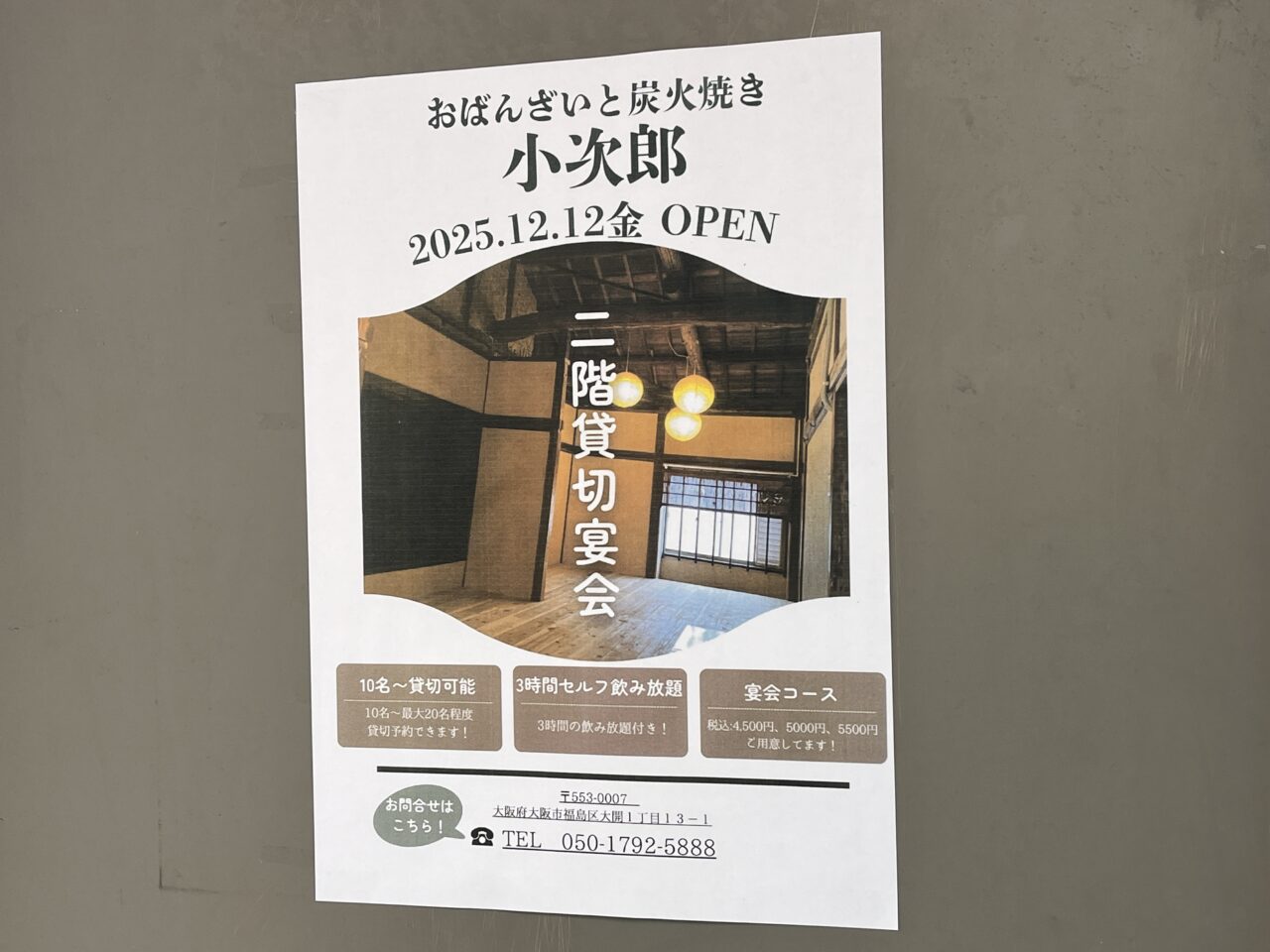 2025年12月12日(金)大開1丁目に「おばんざいと炭火焼 小次郎」がオープンしました。