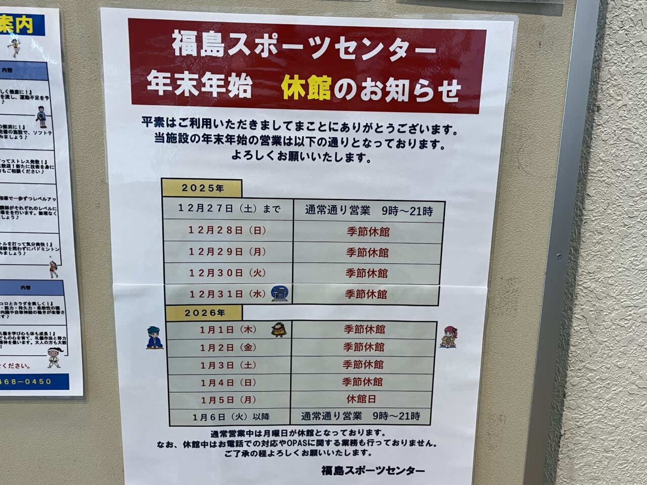 下福島屋内プール、此花屋内プールは2025年12月28日(日)~2026年1月4日(日)まで、福島スポーツセンターは12月28日(日)~1月5日(月)まで休館です。