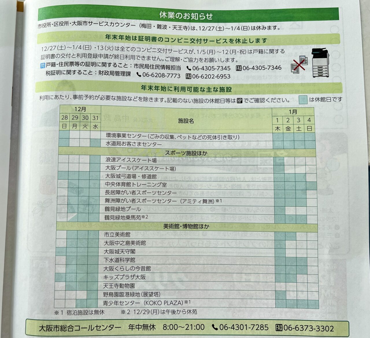 年末年始は、大阪市の多くの業務がお休みとなります。