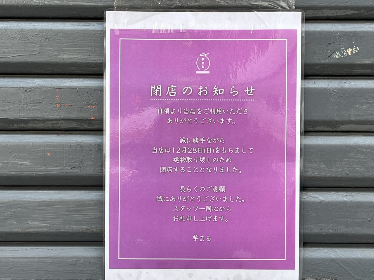 蜜たっぷりの焼き芋とスイーツのお店だったこちら、建物の取り壊しの為2025年12月28日(日)をもって閉店されたそうです。