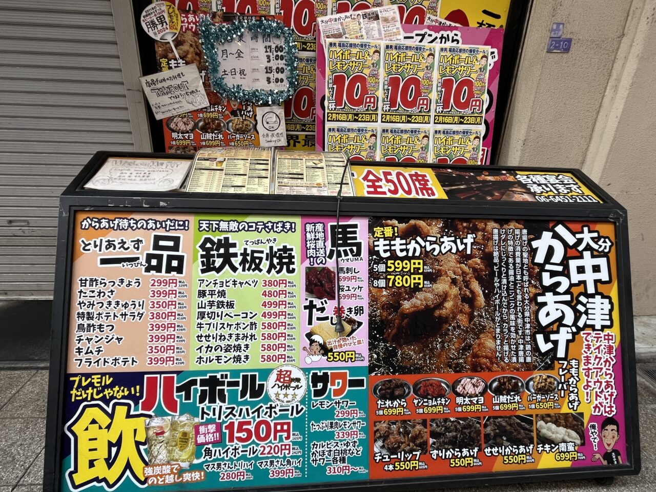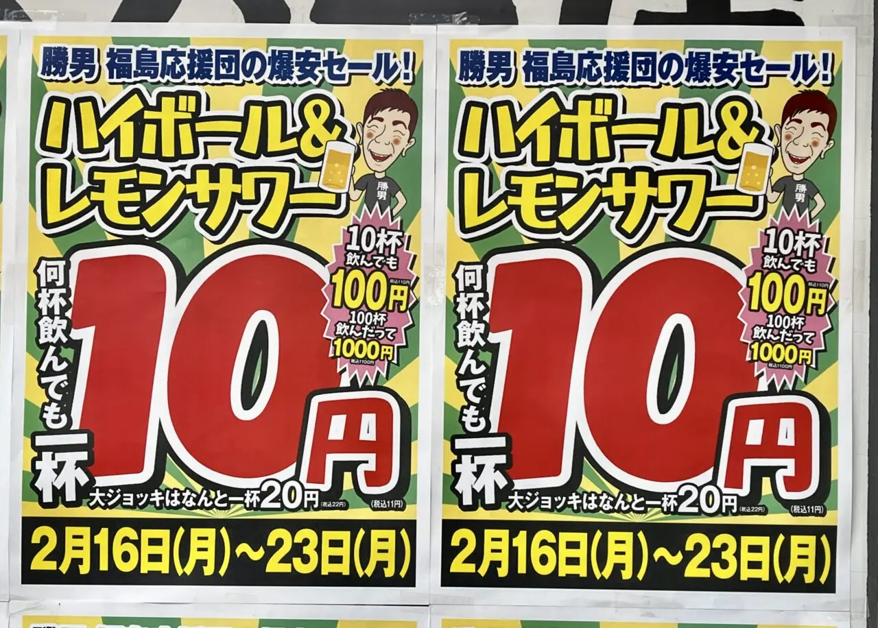 【大阪市福島区】ふくまる通り57の「福島応援団勝男」2月16日(月)~23日(月)の期間ハイボール&レモンサワーが税込み11円