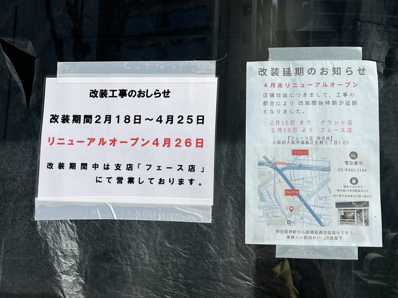 改装の期間は2月18日(水)~4月25日(土)とのこと。リニューアルオープンは4月26日(日)です。改装期間中は吉野2‐1‐23の系列店「FAITH(フェース)」にて営業が行われています。