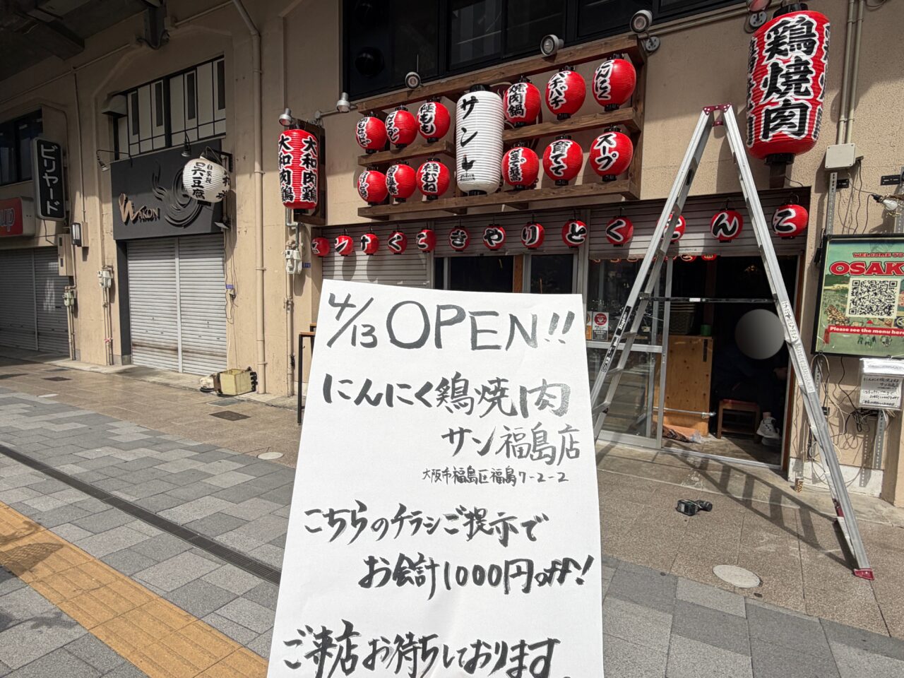【大阪市福島区】ふくまる通り57「蒸発酒場 蒸っ酒ぽっぽ」跡に「にんにく鶏焼肉サン 福島店」が4月13日(月)オープン予定