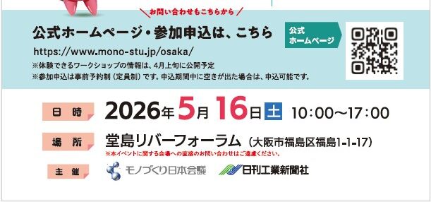 2026年5月16日(土)堂島リバーフォーラムにて、3歳~中学3年生頃のお子さんを対象とした理科や科学への興味・関心を喚起するモノづくりの体感ができる子ども向けワークショップイベント「モノづくり体感スタジアム2026 in 大阪」が開催!