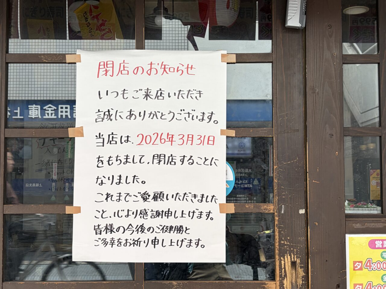 まぐろ刺身や日本酒が1円などの激安メニュー、たこの踊り食い、昆虫食など驚きのメニューが揃うお店でしたが2026年3月31日(火)をもって閉店されたそうです。